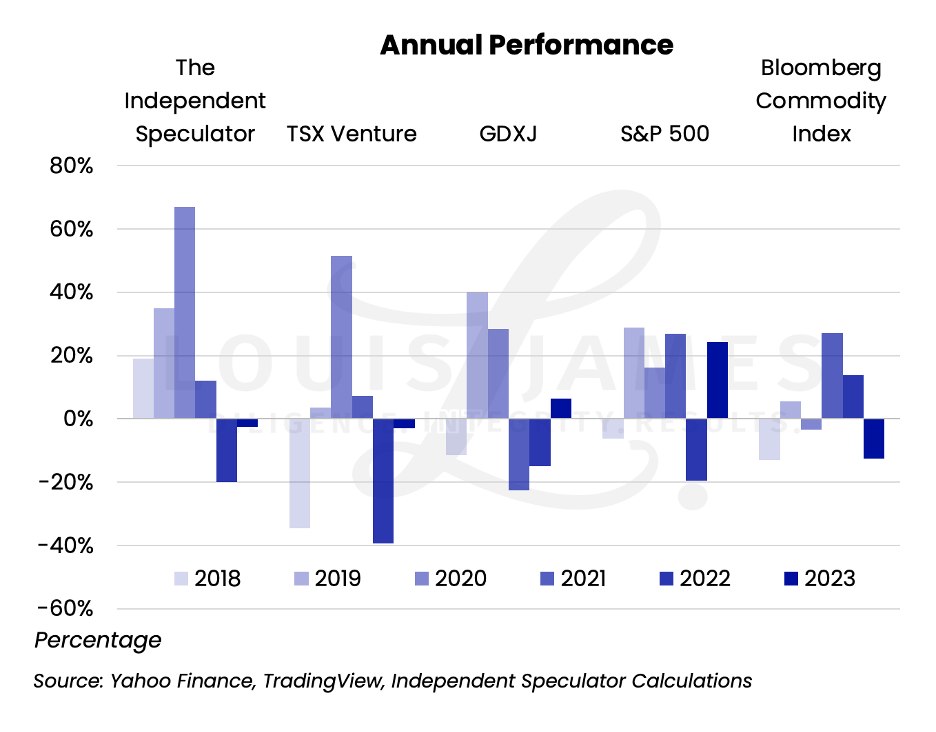 Then again, if we average these yearly gains and losses, The Independent Speculator has delivered +18.42% since inception, while the S&P 500 only yielded +12% over the same period. The TSX-V was -2%, the GDXJ +4%, and the Bloomberg Commodity Index +3%.