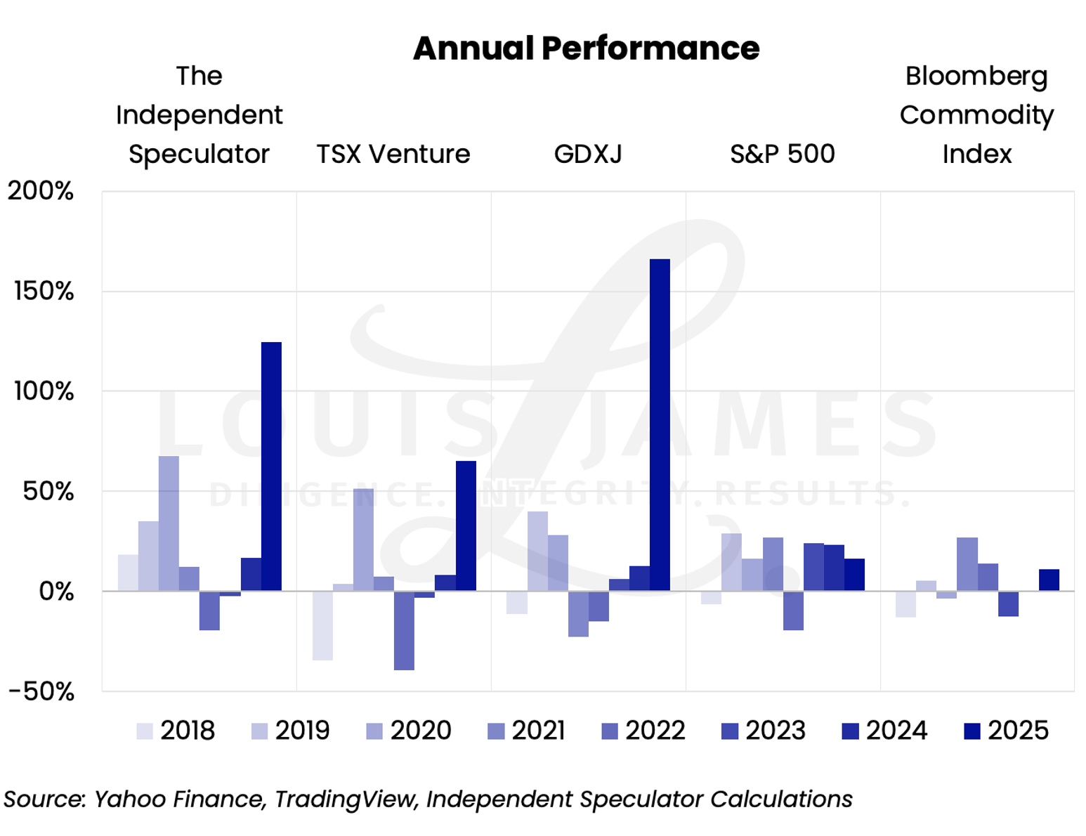 Also, a client wrote in to say that I shouldn’t compare The Independent Speculator’s annual results to the GDXJ because that’s based on gold and silver, while my portfolio has uranium, copper, and oil in it. It’s a fair point, but I’ve long used the GDXJ as a benchmark, and I don’t want to be seen as moving the goalposts. That said, it’s true that if we consider my gold and silver picks only, they averaged 197% in 2025, beating the GDXJ’s 166% handily.