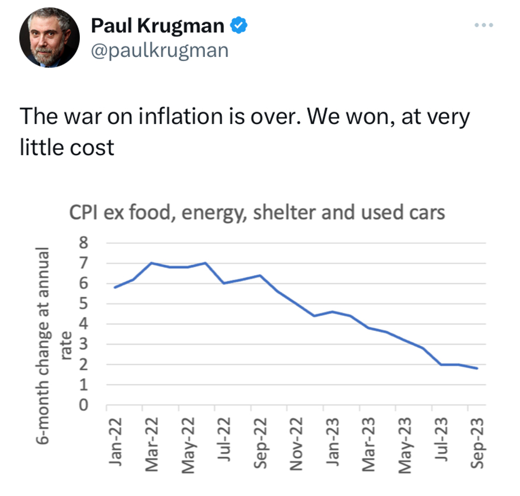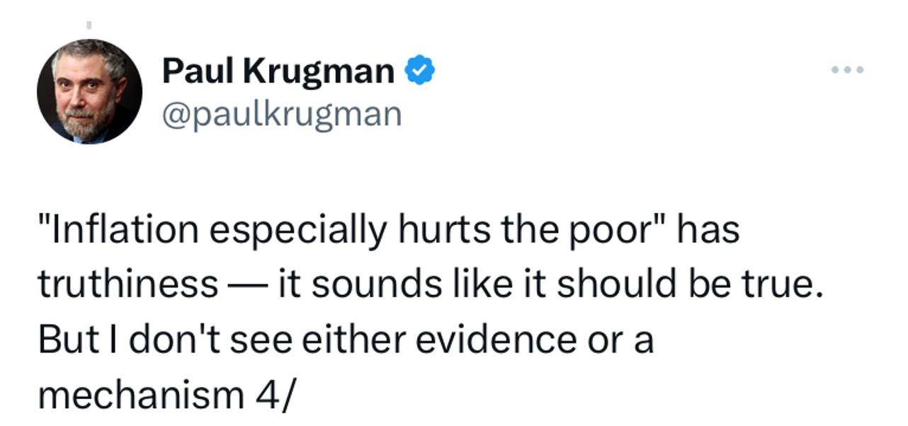 We can look to Paul Krugman to explain the discrepancy. While he holds no power directly, Krugman is a great representative of modern economic thinking. In 2021, he posted this utterly disconnected absurdity: