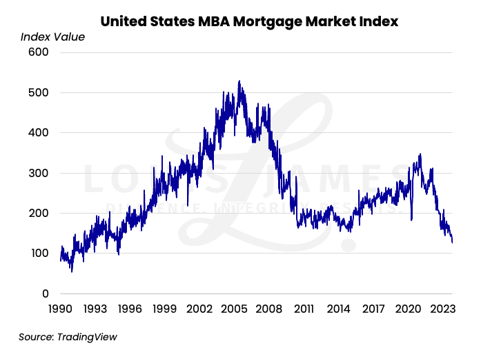 Fannie Mae estimates that US home sales will slump to 4.8 million this year, the largest sales slowdown since 2011. In August, US housing starts hit a three-year low. It seems even the wealthy are changing their behavior in response to economic conditions. Home foreclosure notices in the third quarter are up 34% year on year (YoY). The US Mortgage Market Index is hitting multi-decade lows.