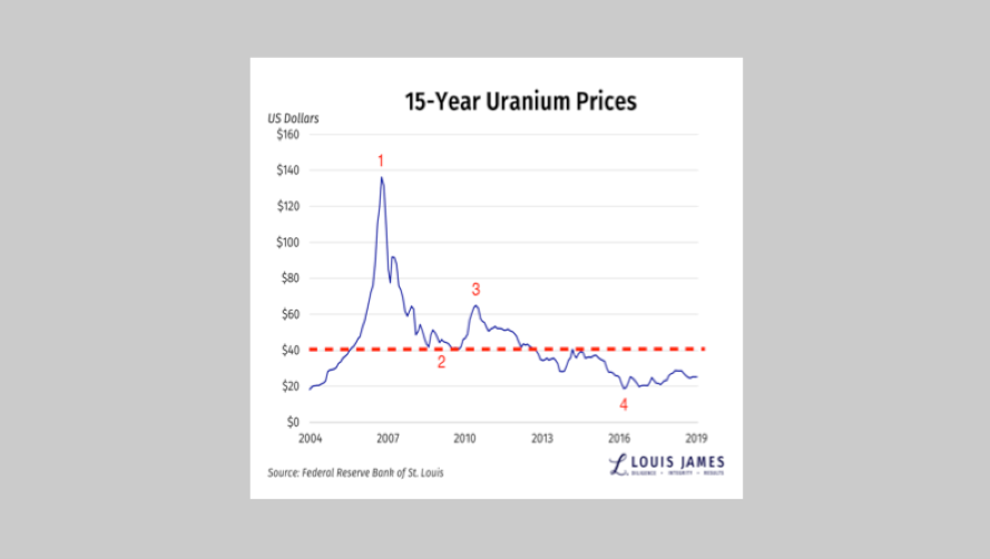 4] The bottom of the market was—and remains—at around $18 per pound of U3O8in early 2016. Prices are up a good 40% since then, but as you can see, they still have a long way to go higher before anyone will bother bringing supply online.