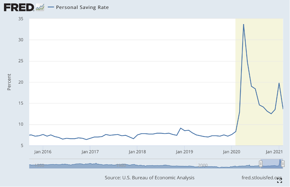 Also, it’s not just the banks that impact the velocity of money. The response of many individuals and households to the COVID-19 situation was to save money. That’s short-term deflationary as it reduces the velocity of money. So what happens when that goes into reverse? I’m sure it will—and not just based on a hunch. We’ve already seen the US savings rate decline after the first and second COVID-19 surges in the US.