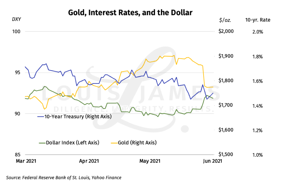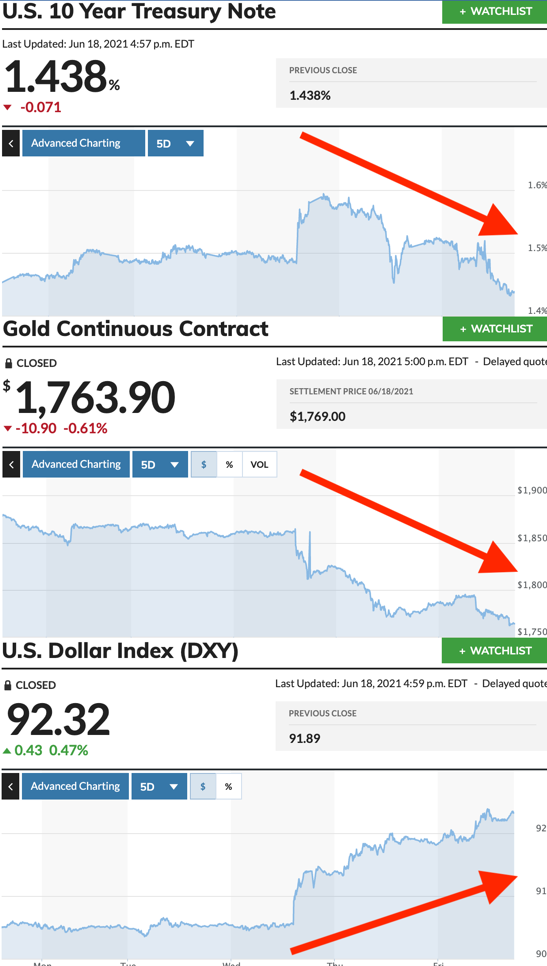 This was undeniably on display last week when the FOMC announced no policy changes, but Powell said they’ve begun “talking about talking about” tapering in a couple years. Though reasonable—and inevitable, at some point—the taper talk was apparently not expected. Interest rates spiked immediately. So did the US dollar, as measured by the DXY index of the USD on foreign exchange markets. Gold dropped as robotic traders responded with robotic lack of intelligence.