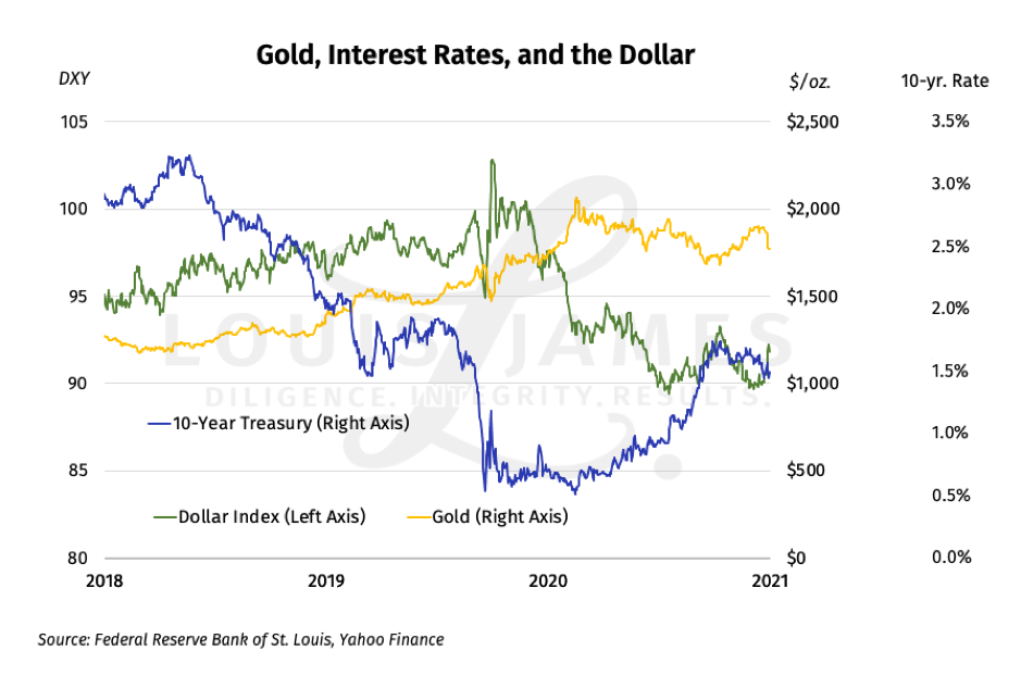 If we pull back and look at these three variables—the US dollar, gold, and interest rates—over the last three years, we see that the lines for gold and the US 10-year are much more closely inverse than those for gold and the dollar.