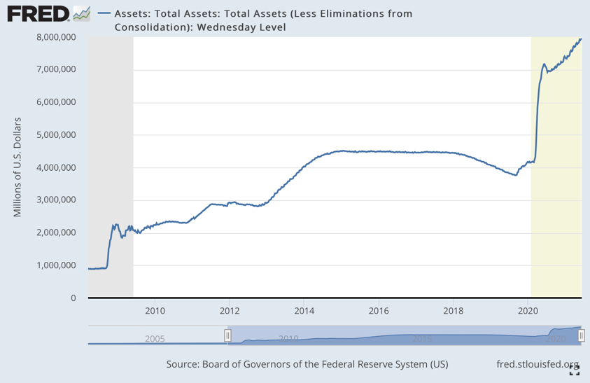 It doesn’t show on the long-term chart above, but US policy has greatly accelerated the dollar’s debasement over the last year. Consider the Fed’s balance sheet, which has now officially hit $8 trillion in response to monetary policy.