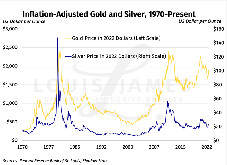 In nominal terms, gold may look expensive—I did just say it’s up 44x since 1971—but that’s really just a measure of the value the US dollar has lost. In my view, the long-term gold-dollar exchange ratio is a real measure of inflation—not the phony CPI, PCE, and other measures governments report.