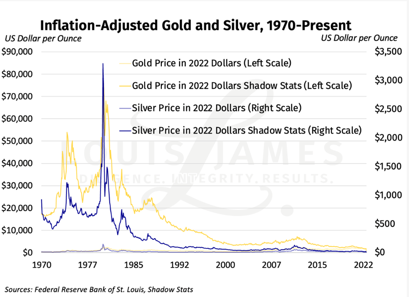 If we look at gold and silver using John William’s ShadowStats inflation, they look cheaper than dirt. The difference is so huge, the regular CPI-adjusted lines look almost flat along the bottom of the chart.
