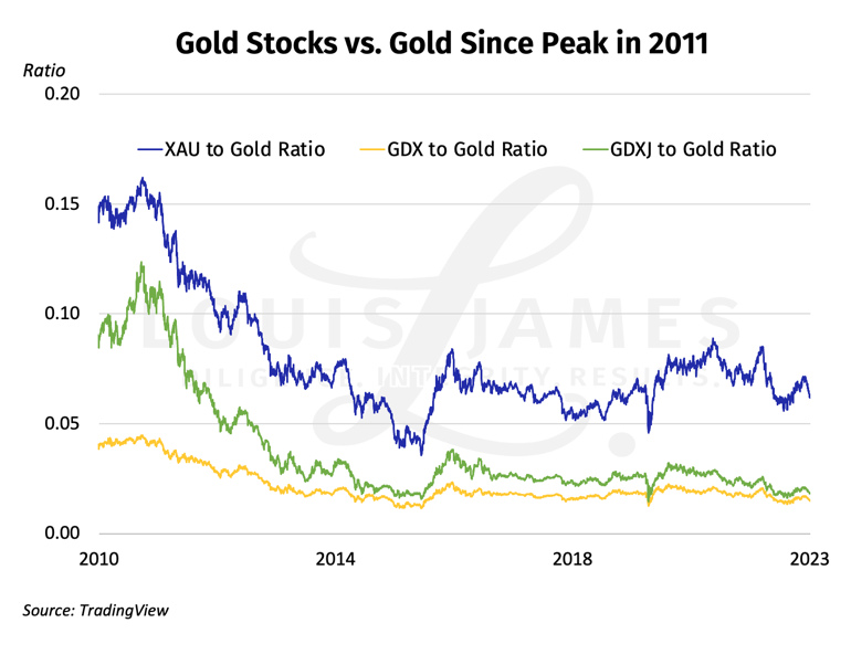 Note that the GDXJ junior gold miners fund only goes back to 2009. Still, despite higher gold prices since then, gold stocks are clearly not getting anywhere near the premium they got during the 2011 spike.