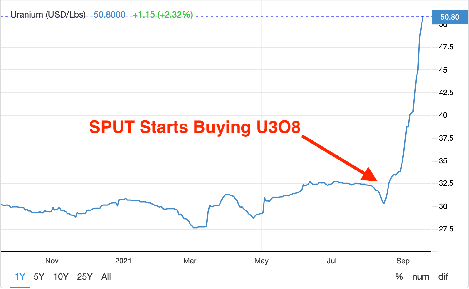 And since the supply of cheap uranium has evidently been bought up, SPUT’s buying keeps sending spot uranium prices higher. This attracts more investors to SPUT, creating a virtuous cycle.