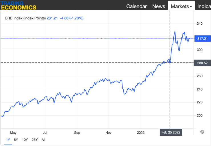 As resource speculators, however, the key point is that Russia has a “resource economy.” It supplies a large part of the world’s energy needs as well as many other minerals and commodities. So it’s no surprise to see commodity prices spiking since Russia’s invasion of Ukraine started on February 24, 2022. Just look at the recent vertical leap in this CRB Commodity Index chart from Trading Economics.