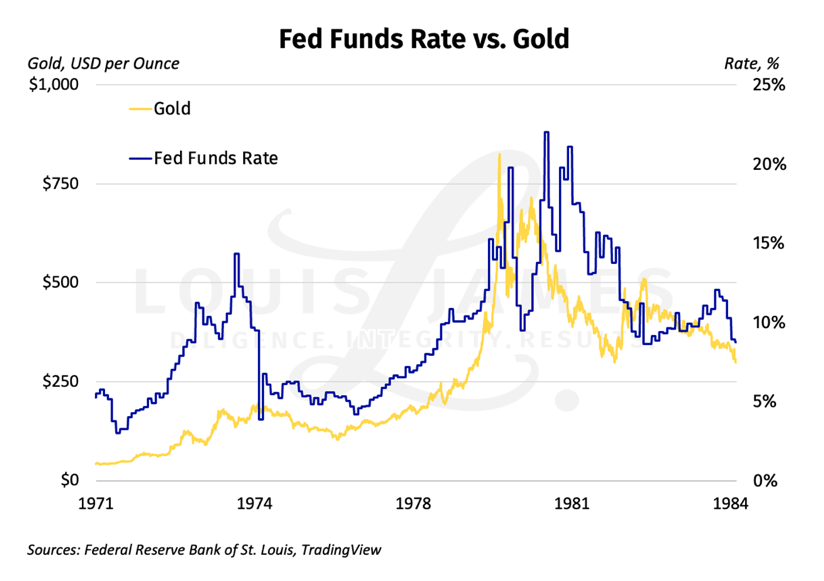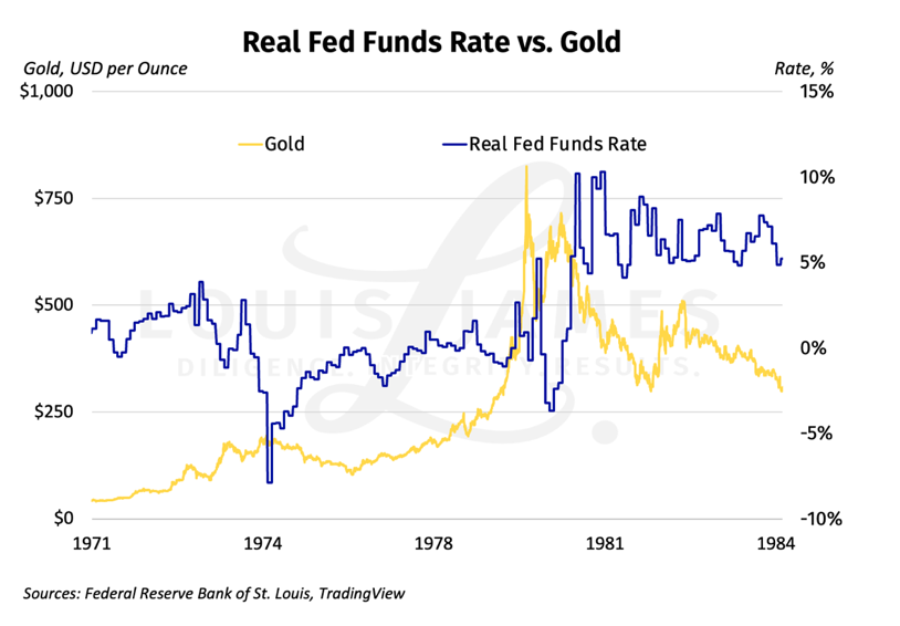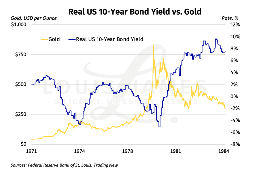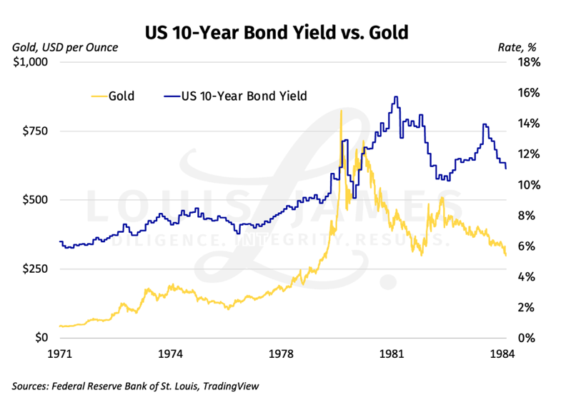 Searching for an answer to this, we looked at how rates and gold behaved in the great bull market of the 1970s and its unwinding in the yearly 1980s.