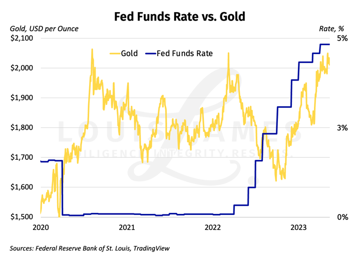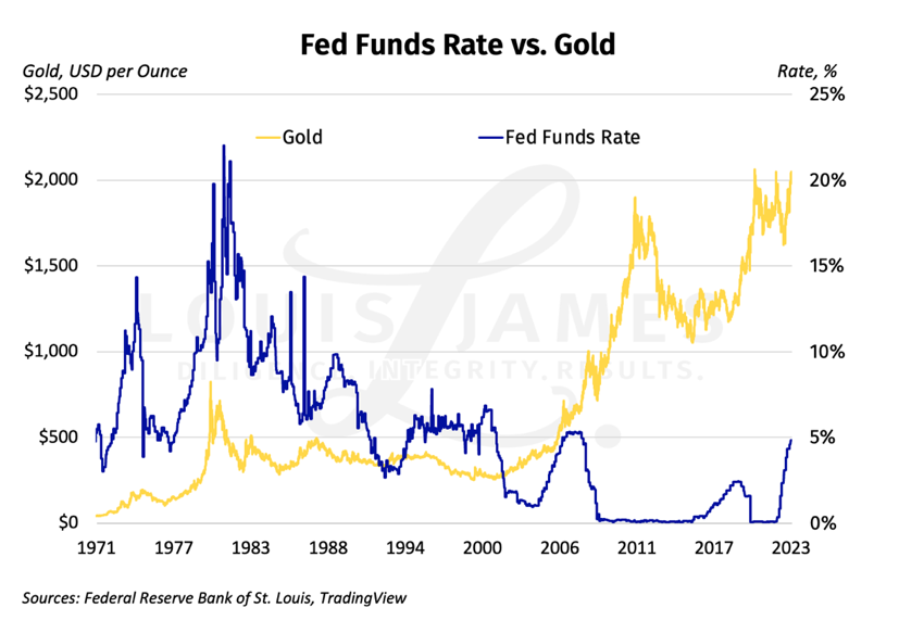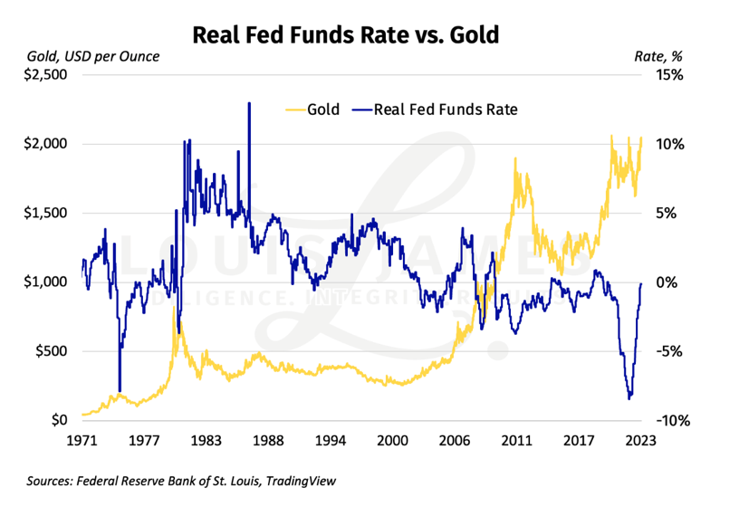 And here’s the same chart of the nominal Fed Funds Rate versus gold. Fed intervention since the GFC has clearly muddied the relationship.