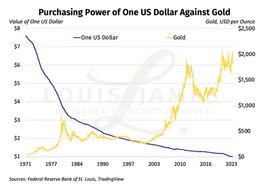 The US dollar was defined as a certain amount of gold at inception. After taking gold out of physical circulation in 1933, President Franklin Delano Roosevelt changed that definition, devaluing the dollar by 59%. President Richard Nixon finished the job of debasing the dollar in August of 1971 when he removed its gold backing entirely. The greenback became a “floating abstraction.”
