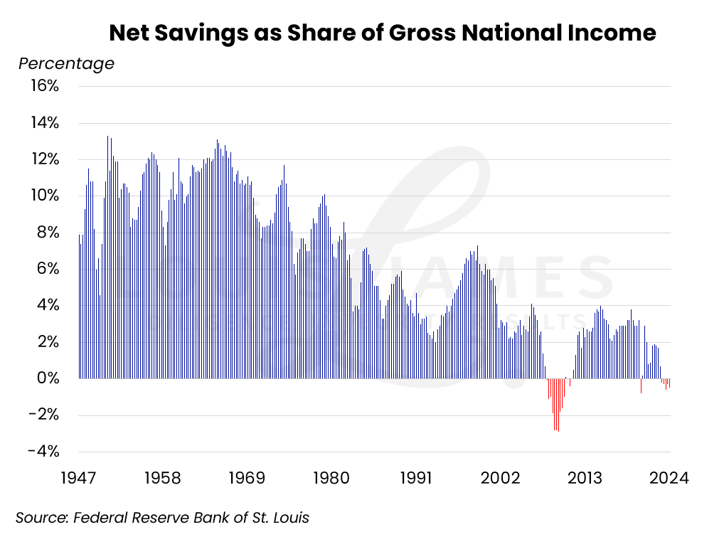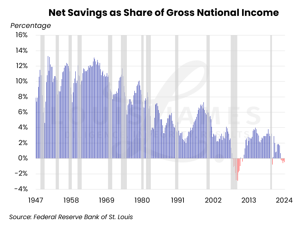 It shows how net savings have related to gross national income since 1947. Important for our purposes, it highlights periods when this ratio went negative: