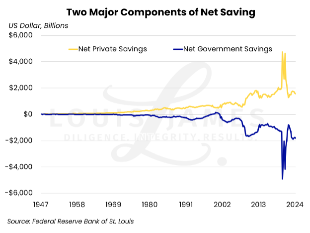 The point, however, is that even if we take the COVID-19 spikes out of the chart above, government debt (negative savings) is increasing faster than private (actual) savings.