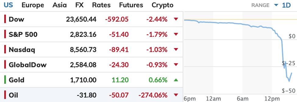 That was an artifact of the front oil futures contract expiring today. The market essentially went “no bid,” and traders had to pay people to take the expiring contracts off their hands, lest they be forced to take physical delivery of oil they could neither use nor store.