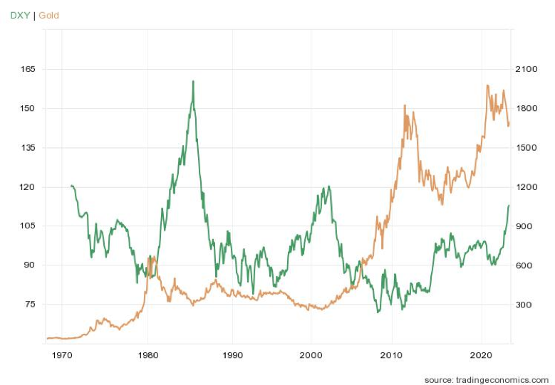 Trends in the DXY—especially turning points—have predictive power for the gold-dollar exchange ratio.