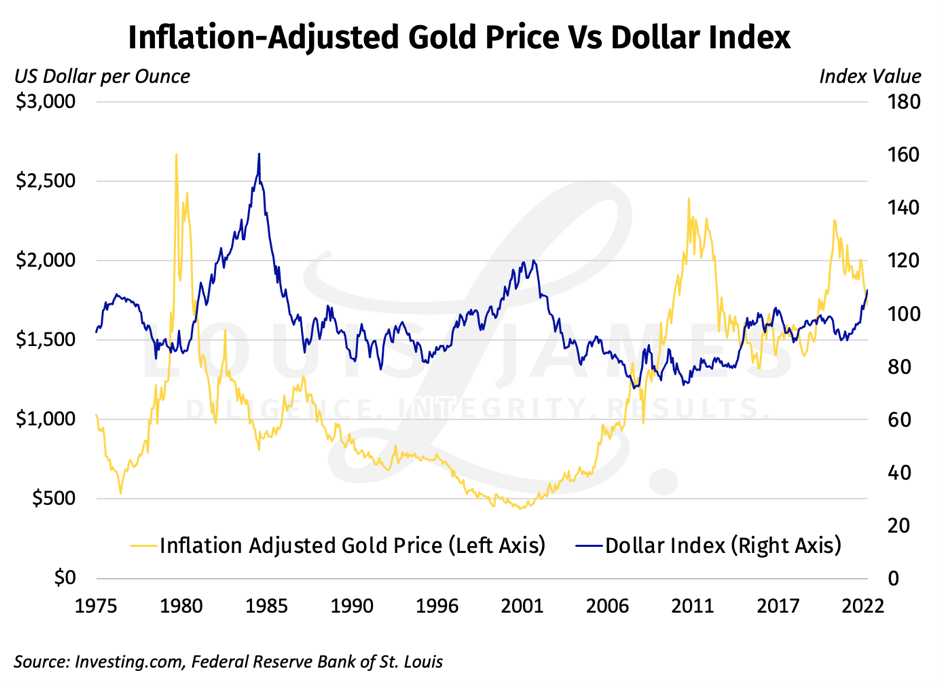 The Trading Economics chart above may make gold look overbought as well. But remember that the DXY compares the dollar to a basket of currencies that are all inflating. That’s a sort of built-in adjustment for inflation and why the overall DXY trend is basically flat. Gold is not adjusted for inflation by Trading Economics, so we’ve redone the chart with Fed data, adjusting for inflation.