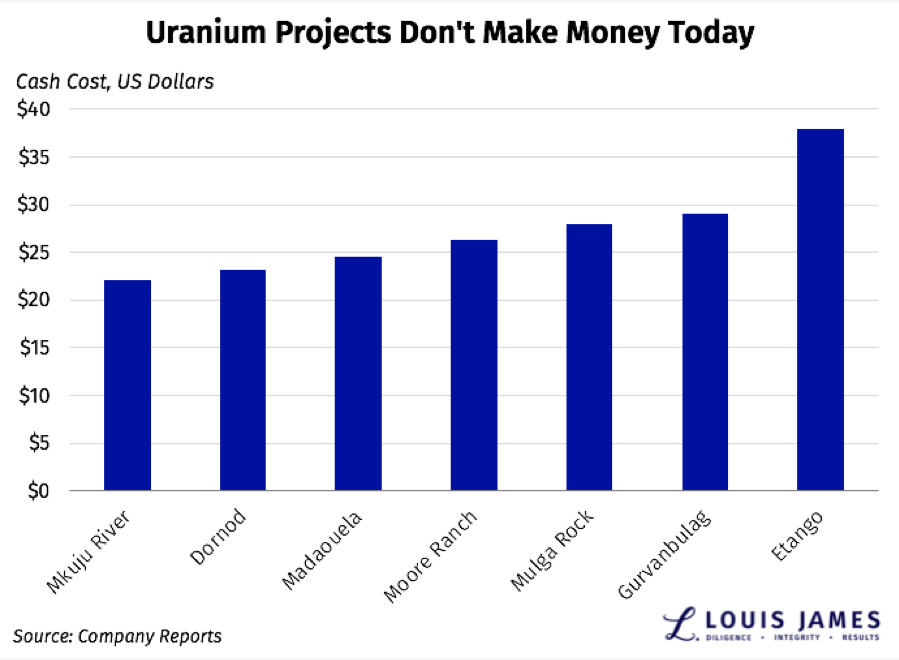 Note that the cost per pound of production in the chart above is a cash cost figure, not an all-in cost. You can add 50–100% to the bars above and still get a conservative estimate for how high uranium prices would have to go for these projects to become profitable.