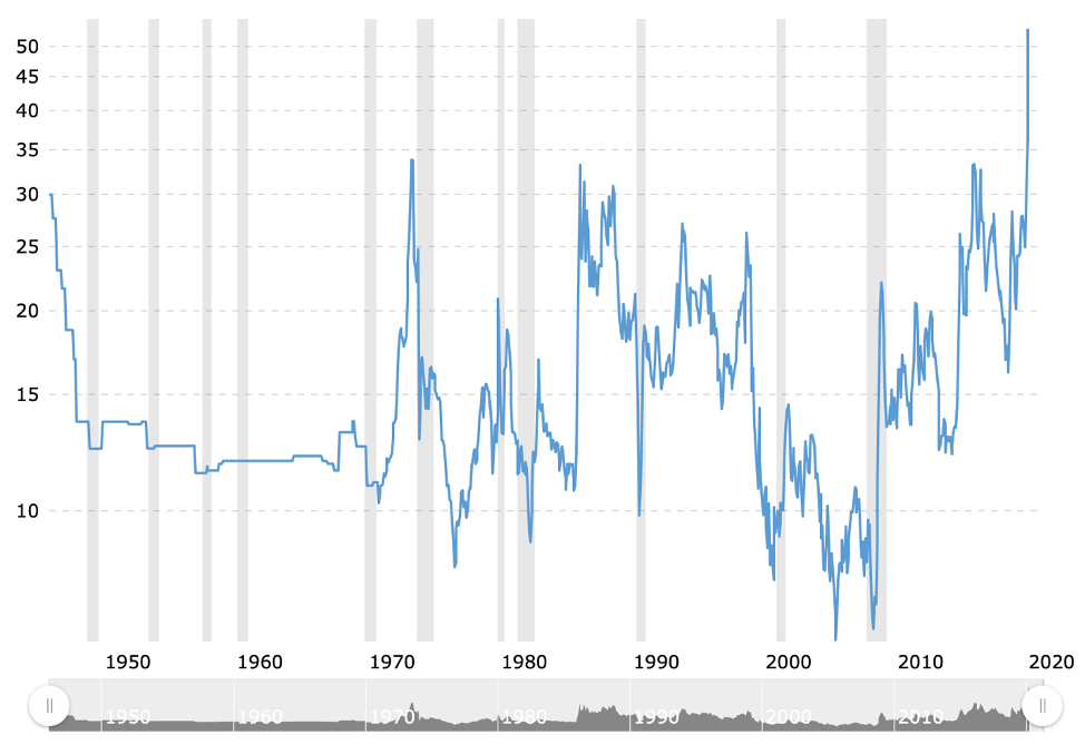 Note that the line is less volatile before 1971, because that’s when Richard Nixon took the US dollar off the gold standard. The grey bars indicate recessions.